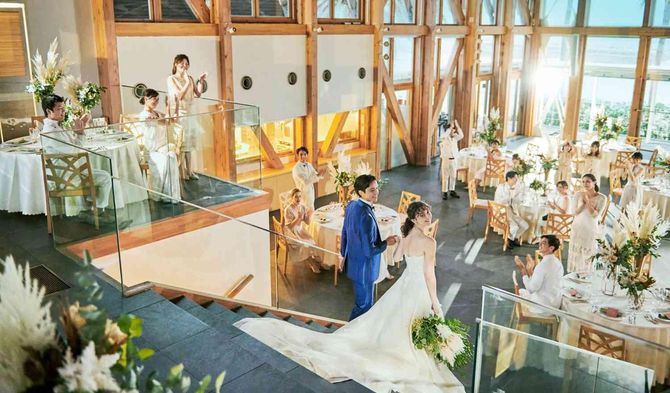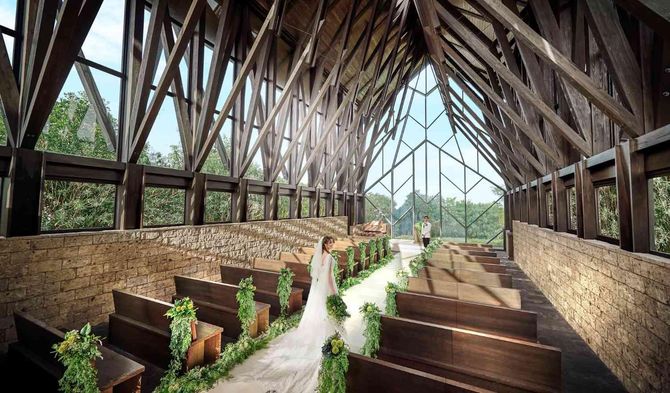 選べる2つのチャペルで、ふたりにぴったりの誓いの舞台を。 一面ガラス張りのバージンロードが青空と花嫁を映す「水のチャペル」は、絵画のような美しさ。 天然木に包まれ、そよ風や鳥のさえずりが響く「木のチャペル」は、自然と一体になれる特別な空間。