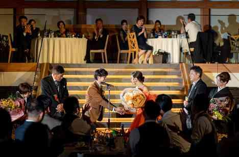ラヴィマーナ神戸内でも大人気のご披露宴会場「瑠璃」にて執り行われたご披露宴でしたが そのご披露宴終盤になんと・・・新郎様から最愛の新婦様へサプライズが行われました!新婦様のお好きなお色味を使った大輪の花束とメッセージで新婦様への愛を改めて御伝えにさられた新郎様 会場全体は感動に包まれておりました・・・♥