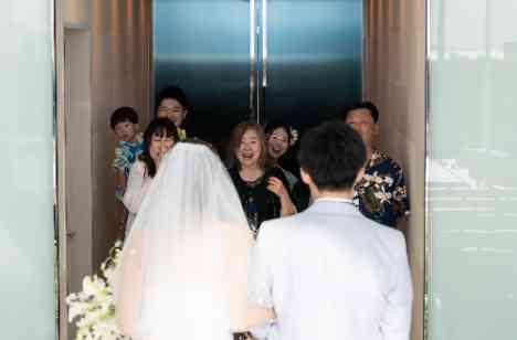 お二人がお仕度を終え、向かった先はチャペル。 挙式前にご家族との時間を過ごしたいというお二人の想いから、ファミリーミートの演出を取り入れ皆様のもとへ。ご家族全員が集合している中、チャペルの扉がオープン! お二人の姿を見て、ご両親様は想いが溢れ感動で涙が・・・。 ファミリーミートはご家族と特別な時間を過ごせる感動の演出の一つです♡