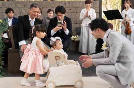 挙式では、おふたりのお子様と姪っ子ちゃんにとても可愛い『リングガール』をお願いしました。可愛いドレス姿で準備OK!!木の車に乗った娘ちゃんを姪っ子ちゃんが一生懸命進ませ、緊張しながらも一歩ずつおふたりのもとへリングをお届けしました☆そんなお姿にゲスト様が「がんばれ!」と応援するお姿も♡ご家族の思い出に残る大切な瞬間となり、会場全体があたたかい雰囲気に包まれる素敵なワンシーンでした。