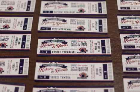 野球がお好きはお二人☆ご来館と同時に皆様に楽しんでいただきたいと会場のコーディネートやペーパーアイテムもこだわり、ゲストの方の席次表はひとりひとり野球チケットを見立てて作成しました☆ お二人のつくった世界観をお式スタートまで皆様楽しまれておりました♪大切な方へのお二人からのオリジナリティあるおもてなしの空間でした・・・♡