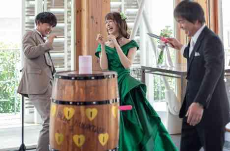お二人が各卓1名ずつくじで選ばれた方たちによるBigクラッカー大会がスタート☆大樽にナイフを刺していき、中央のクラッカーを鳴らした方はお二人より素敵なプレゼントが☆ 御覧になられているゲストの皆様も挑戦されている方もハラハラドキドキの中挑戦していき、ついにクラッカーが!! 会場全体が大盛り上がりとなった素敵なイベントとなりました☆