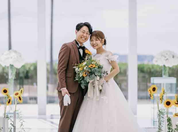 ひまわりが好きなご新婦様はひまわりをたくさん使った会場コーディネートをご希望されておりました。沖縄で挙式を挙げていたことも有り、リゾート感のあるモンステラやアレカヤシを使いグリーンを取り入れました。ひまわりもいろいろな種類を取り入れ、オレンジのお花もMIXして華やかに仕上がりました♡会場だけでなく、チャペルのバージンロードにもひまわりをあしらい、大満足のコーディネートが完成しました♪