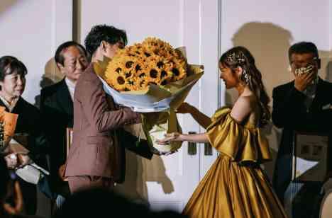 披露宴の結びには新郎様から新婦様へサプライズが!ご準備されたのは新婦様が大好きなひまわりの100本の花束♡花言葉は「100%の愛」。ファーストミートの際にお渡ししたひまわりと合わせて、全部で101本のひまわりをプレゼントされたご新郎様。花言葉は「これ以上ないほど愛しています」ロマンチックな永遠の愛の誓いに、会場からは大きな拍手が沸き起こり、おふたりの特別な1日が結びました♡