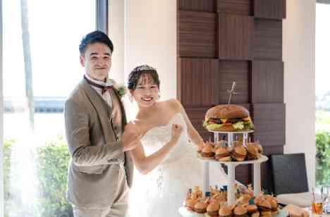 お二人がファーストバイトの演出に選ばれたのはなんと!ハンバーガータワー!ゲストに楽しいんで欲しいと見た目から盛り上がるハンバーガーをお選びになりました。スタッフがハンバーガータワーを持って登場するとゲストから歓声が♪大きな口を開けてパクっとかじる姿はとても微笑ましいですね。ゲストもたくさん写真を撮って楽しんでいました!