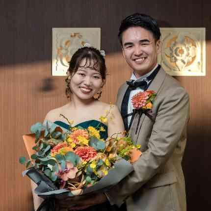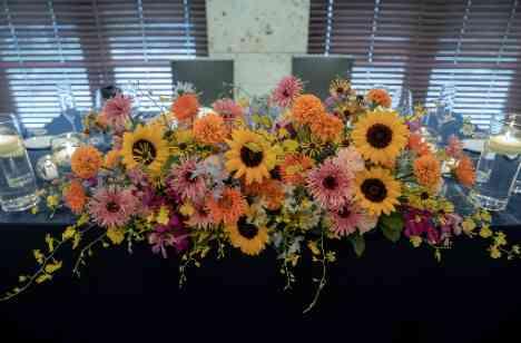 結婚式が8月の開催ということで、テーマは「花火」にしたいとご希望がございました。会場のお花は花火をイメージして、ピンク・イエロー・オレンジの色味で鮮やかに。お花の種類はひまわりやスパイダーガーベラなどを使い花火のようなインパクトを出しています♡結婚証明書やケーキも花火をモチーフにしたデザインをお選びいただき、統一感のある素敵空間になりました。