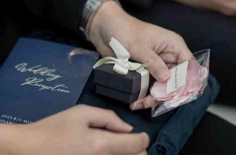 ブルービジューチャペルにて人前式がスタート。お母様にベールダウンをしていただき、お父様と一緒にご新郎様のもとへ。指輪交換では、受付の際ににゲストが受け取った小さい箱を一斉にオープン!中に指輪の入っていたゲストがお二人のもとへ指輪を運んでいただく「サプライズリングセレモニー」というゲスト参加型の演出を行いました♪誓いのお手伝いが出来て誇らしい気持ちになりますね!