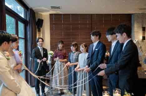 ご新婦様の手にはお菓子のブーケが有り、そこから何本ものリボンが伸びています。この中の1本がお菓子ブーケにつながっていますので、そのリボンを引くと見事お菓子ブーケをGET!ブーケプルズというと新婦側のゲストに向けた演出としてお花で行うことが多いですが、新郎側のゲストにも楽しんで欲しいとこの演出をお選びいただきました!ドキドキしながら楽しんでいるご様子でした!