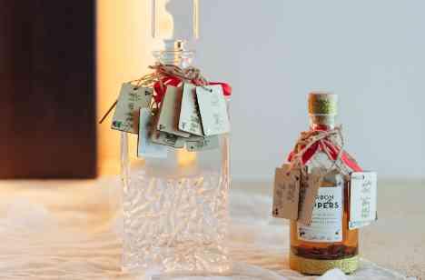 ご新郎様はウィスキーがお好きということで、ウィスキーボトルの装飾をゲストの皆様にしていただくことに。お二人がご用意された未開封のウィスキーボトル。受付の際にゲストの皆様にステッカーやタグにお名前を書いてつけていただき、世界に1つだけのオリジナルボトルを完成させることが出来ました。結婚式の後も、ご自宅に飾って楽しかった余韻を楽しめるのも素敵ですね。