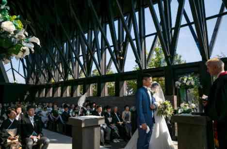 おふたりの大切なゲスト(約90名様)に落ち着いた雰囲気の中で全員着席して挙式に参加して欲しいという新郎新婦様の想いから森のチャペルを。天井高13M、ガラスが沢山の開放的な雰囲気はまるで屋外にいるような気分に。