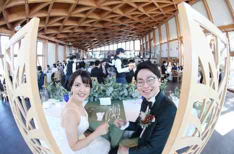 挙式と同様に、BGMなどにこだわりをもっていたのでタイミングなどもお伝えさせてもらっていました。乾杯の瞬間にカーテンが開いて太陽が差し込み、同時に音楽が流れると列席者からは「おおーっ!」と声が上がりました。打ち合わせでは、装花イメージの画像を準備してボリュームや色味など細かい提案をさせていただいたのですが、想像以上に素敵で感動しました。細かいこだわりを丁寧に叶えていただき、とてもうれしかったです。