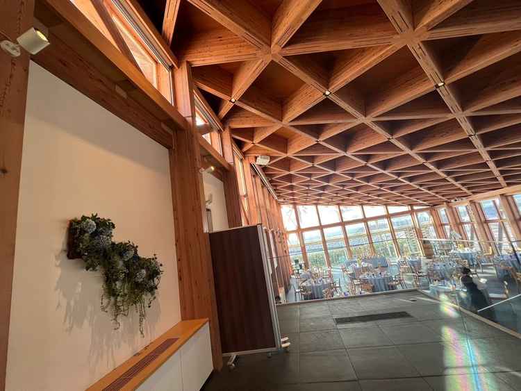 大きな窓のあるチャペルは沢山の自然光が入り、開放感があった。披露宴会場も窓が多く、特徴的な内観と階段があることがよかった。
