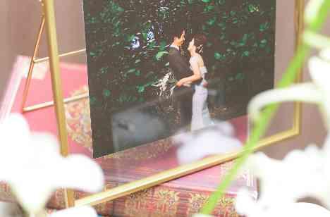 会場全体は白の装花でまとめ、上品な雰囲気に。ウェディングケーキにはキラキラをイメージして金箔を飾りました。テーブルにはゲストひとりひとりのネーム入りのアルコール消毒を準備。ボトルは某おしゃれ美容ケアブランドをイメージしたデザインで、特に女性ゲストに好評でした。ゲームや演出だけでなく、アイテムなども楽しんでいただける工夫もしました。