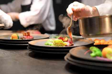 おふたりの思い出をエピソード料理でご紹介しました。前菜は出会いのきっかけを。会社の旅行で一緒に見た大空に浮かぶ満天の星空をイメージ。お口直しにはプロポーズの思い出にバラの花びらを添えて。結びは新婦様がよく作られるしそご飯をパーティ中にコーヒーサイフォンで抽出したお出汁とともにアレンジされたレシピでおもてなししました。