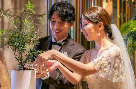 結婚式の始まりはおふたりだけのファーストミート。その後、ご家族とのファミリーミートも行いました。挙式では新郎様のご趣味の観葉植物で植樹セレモニーを。ゲストに一杯ずつ土を添えていただいたオリーブに両家の水合わせの儀をしました。ご退場もリーフシャワーでおふたりらしく。BGMは会場のオリジナルセレクトBGMを使用して、堅苦しくなくゲストが自然体で過ごせる雰囲気を演出しました。