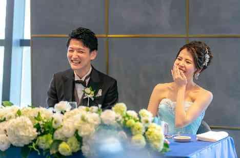 「おふたり×ゲスト」「ゲスト×ゲスト」ひとつの輪のように繋がる1日。明るく、笑顔あふれる雰囲気づくりやゲスト参加型の演出など、輪になれるような工夫をしました。夏らしいコバルトブルーの会場はタワーホテルの眺望と混じり合い、天空を感じさせるようなコーディネート。優美な白と爽やかなグリーンの装花でラグジュアリーな印象に。