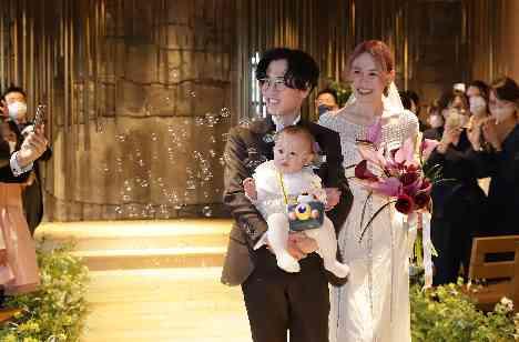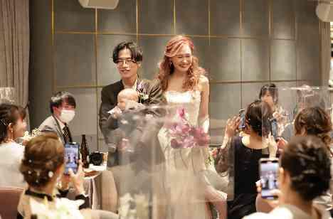 少しだけ覆われたキャップスリーブがチャーミングなスタイリッシュラインのドレス。シルクジョーゼットのスカートと印象的なレースやビジューが配された一着です。ブーケは上品でエレガントな印象のマゼンタ色のカラー。繊細なビジューが煌くドレスにピッタリのデザイン。挙式ではウェディングカーに乗った愛息子くんの愛らしいご登場で、会場の雰囲気は穏やかな時間へ。シャボン玉の優しい光に包まれながら門出の瞬間を迎えます。