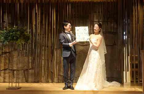 新婦様が誓いの場に選ばれたドレスは立体的な刺繍デザインが華やかなスレンダーライン。ボヘミアンな雰囲気と軽やかに揺れる裾で遊び心をプラスした一着です。シンプルにまとめられたヘアスタイルが、ドレスのデザインをより魅きたてます。結婚証明書はウェディングキャンバス。ゲストの想いが込められた1本1本にお二人の誓いを重ねてお披露目しました。