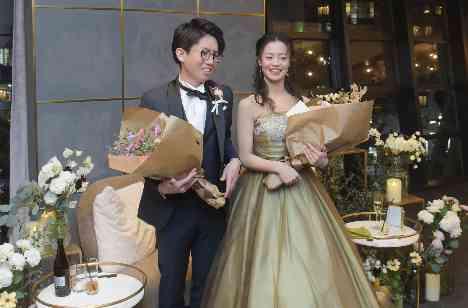 前半は歓談をメインにおひとりおひとりとの時間を大切に。後半はクイズ、サプライズと様々な演出でゲストと楽しい時間を共有しました。「ドレスのカラー当てクイズ」では、オリーブカラーのチュールドレスで登場。柔らかいハーフアップで大人可愛らしいテイストにイメージチェンジ。夜景も広がり、ドレスの光沢との一体感がより綺麗な演出になりました。