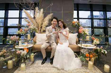 ウェルカムスペースには「笑顔のお二人」が溢れるオリーブの木。日々を大切に想うお二人の気持ちが伝わるような温かさを感じます。パーティ会場のメインソファは白樺の木とパンパスグラスのボリューム感が印象的なコーディネート。ピンク・アプリコットをアクセントに白基調でまとめられた優しい空間です。「アットホームに楽しく過ごせる結婚式」所々に散りばめられた感謝のおもてなしや演出で笑顔あふれる一日をご紹介します。