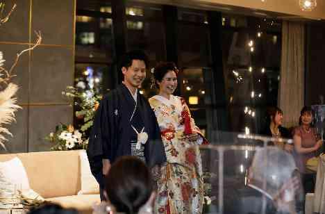 日本の結婚式ならではの和装。お色直しは洋装のイメージと一変し、伝統的な和装でご登場されました。そのギャップにゲストの皆様からも歓声が湧きます。色どり豊かに大花が舞う浅黄の色打ち掛けは、髪飾りのトーンも合わせ、温かみのある装いに。ナイトウェディングの空の深みと夜景の輝きが全窓に広がり、より和装を華やかに引き立てます。洋装も和装も自由に楽しみ、形式にとらわれないお二人らしい結婚式となりました。