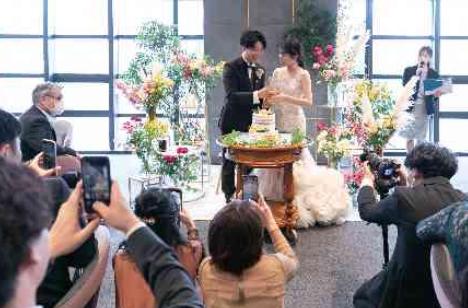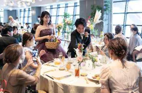 お料理も気に入ってくださったお二人はメニューの中に思い出やエピソードも重ねておもてなしをされました。全体で楽しめるクイズを交えながら、歓談も重視してゲストおひとりおひとりとの時間も大切に。お色直しでは特別な思い出をプラス。ヘアカットでふわゆるの柔らかい雰囲気にイメージチェンジ。グラデーションが綺麗なワインカラードレスはグリッターが光を集め、その輝きを楽しむようにパーティを盛り上げます。