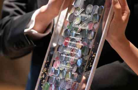 立体的なフラワーが美しく魅せるデコルテが印象的なドレスは幾重のチュールが柔らかく広がる一着。ドレスの透明感とホワイトブーケが出発の日にお似合いの真っ白な美しさを放ちます。新婦様お手製のセンスフルな結婚証明書は「モネの睡蓮」をモチーフにしたART作品。優しさ・清純・甘美の花言葉を込めた想いと共にお披露目。大切な皆様からの祝福とフラワーシャワーに囲まれ、嬉しさあふれる門出となりました。