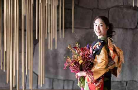 アンスリウム、カラー、オンジジュームのマゼンタ色の花々が華やぐ上品なパーティ会場は洋装も和装も魅き立てる空間です。パーティのはじまりはエンブロイダリーフラワーが咲き誇るウェディングドレスにイメージチェンジして皆様のもとへ。お色直しは絢爛豪華な大振袖でご入場。オレンジ紅のシンビジウムが奥ゆかしい和装ブーケもボリュームいっぱいに美しさを表現するひと束です。