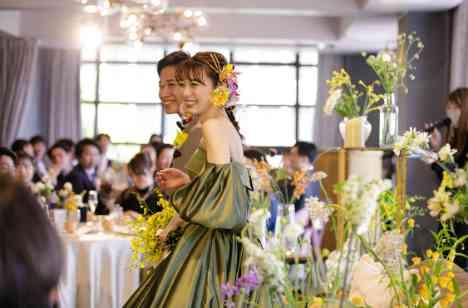 鮮やかなオレンジ・イエロー色の明るさとピンク・パープル系の上品さが華やぐパーティ会場。想いを綴ったメッセージカードはお二人のご入場前にゆっくりお読みいただき、感謝をしっかりとお伝えされました。アートのようなウェディングケーキやお色直しの華やかなヘアアレンジで五感をくすぐる演出があふれるパーティ。楽しさと嬉しさが交差する中座シーンは、見守る皆様も導かれるように最高の笑顔に。