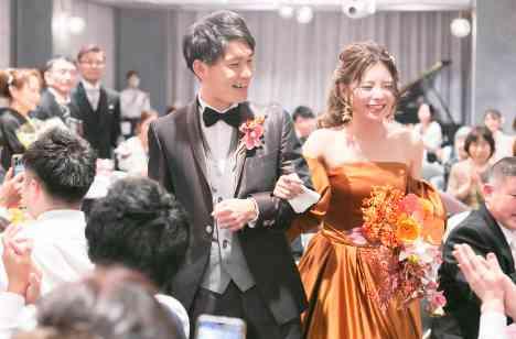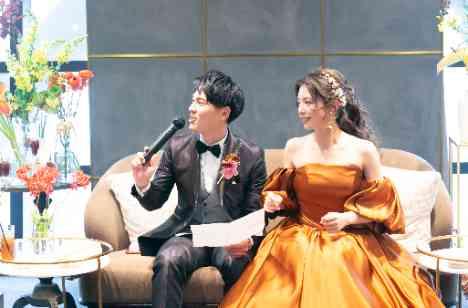 たくさんの時間や思い出を共有してきた大切な皆様と、アットホームな雰囲気で過ごす一日は、ゲスト参加型の演出でオリジナリティある結婚式に。おもてなしを大切にされていたお二人は、この機会にしっかりと感謝の気持ちもお伝えされました。オレンジ・イエロー色のメイン装飾とポップに散りばめれられた花々は笑顔あふれるお二人を映し出すとっておきの空間。その空間で幸せいっぱいに過ごすお二人の結婚式をご紹介します。