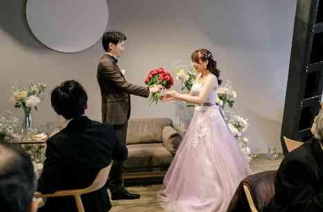 皆様に楽しんでいただきたいという想いから、お色直しのご入場ではゲスト参加型のブーケブートニアセレモニーを行いました。親御様をはじめ、ゲストの皆様からの想いが込められた一輪を新郎様が大切に束ねて、27本の美しいバラのブーケが完成です。27本のバラの花言葉「お互いに愛し続ける」のメッセージを添えて、新婦様へ贈られます。