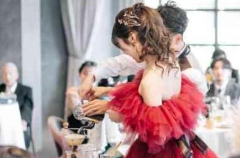新婦様の出身地の名産・お二人の思い出などエピソードレシピ付きのコース料理をご堪能しながら、ご友人のスピーチやサンクスバイトと結婚式ならではの演出も楽しまれます。色当てクイズも交えたカラフルなペンライトが華やぐ空間に、愛らしいラッフルデザインの真っ赤なカラードレスでご登場。パーティの最後は親御様へ、お二人それぞれから感謝のお手紙を読まれました。