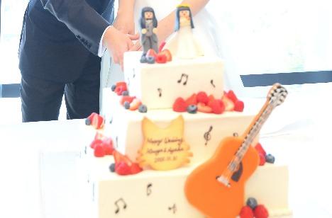 お二人らしいコーデにこだわって色々なところに「音楽」を取り入れました。高砂テーブルにはグッズをたくさん置いてライブのようなイメージに。席次表などのアイテムもレコード型にしたり音楽を感じるデザインにしてゲストがわくわくするような雰囲気作りにもこだわりました。特にケーキへのこだわりが強く、miwaでデコレーションされたウェディングケーキもお二人らしい結婚式の特徴です!