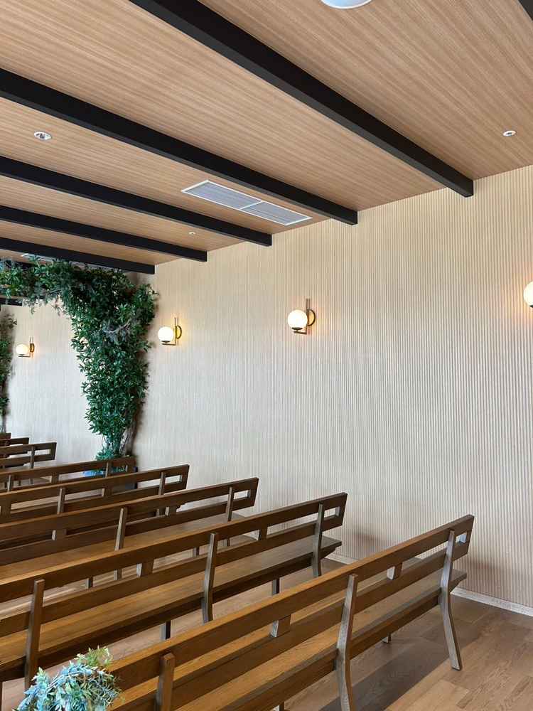 挙式会場は木目調の空間になっていて落ち着いた雰囲気でとても良かった。挙式会場と披露宴会場の窓が格子状なのが気になった。