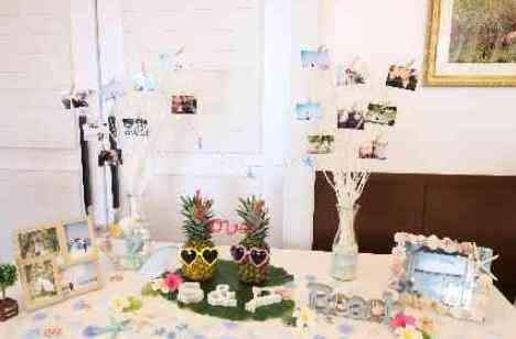 Wハッピー婚のお二人様です♪ 時間がない中でも新郎新婦様共に海が大好きとの事でウェルカムスペースは全て手作りで頑張っていただきました☆ 特にパイナップルのウェルカムドールはお二人らしさのでた力作です!