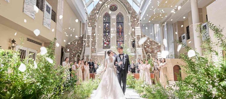 京都の都市部にありながら、全天候型のインナーガーデンを完備。程よい自然光と緑に囲まれた空間で、天候に左右されない安心感の中、ゲストとフラワーシャワーやブッフェ演出を楽しめます。挙式後のウェルカムパーティもスムーズに行えるので安心です。