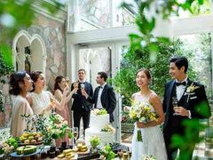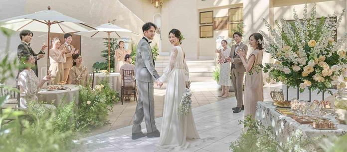 京都の都市部にありながら、全天候型のインナーガーデンを完備。程よい自然光と緑に囲まれた空間で、天候に左右されない安心感の中、ゲストとフラワーシャワーやブッフェ演出を楽しめます。挙式後のウェルカムパーティもスムーズに行えるので安心です。
