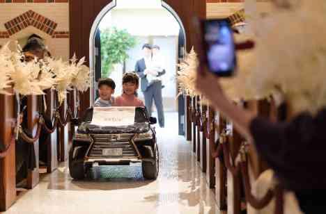甥っ子、姪っ子には絶対リングキッズで指輪を運んでもらいたい!!!と強くご希望されたおふたり。でもただ運んでもらうだけだと良く見るな。。。と悩まれてご決定されたのがなんと車に乗ってお子様登場!少し恥ずかしい様子と笑顔を振りまくお子様を見て、思わずふたりも涙。愛おしくもありつつ、成長した姿を見れるリングセレモニーは大変人気のセレモニーとなっております。