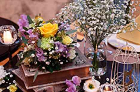 専用のホワイエには手作りアイテムをたくさん飾り、おふたりらしくお出迎え。白を基調にしたバンケットの装飾は何度も打ち合わせを重ね、マーキーライトや洋書、鳥かごなどを使っておしゃれな空間に仕上げました。さらに、ゲストへのおもてなしもしっかり厳選! 「フォアグラを振る舞いたくて、コースをランクアップしました」