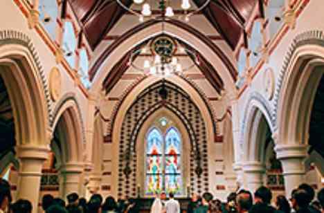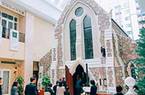 温かみあるハニーストーンの外壁が施されたチャペルは、ロンドンのチェルシーに実在する教会がモデル。新婦様は憧れの赤いバージンロードを歩き、新郎様との誓いの舞台へ。「挙式の間はゲストに撮影を控えていただき、より厳粛な雰囲気でのぞめました。全天候型ガーデンでのフラワーシャワーやブーケトスも開放感抜群でした」