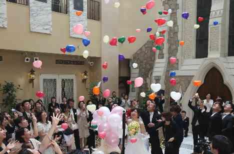 挙式後には全天候型のインナーガーデンにてフラワーシャワーやウェディングプラークのセレモニーを行いました。その中でもよかったのは、バルーンリリースではなくて、バルーンシャワーです。天井から降ってくるバルーンの演出にご列席の方々もビックリされていました。