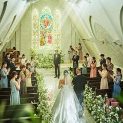 【感動的な挙式を演出】天井高8mのステンドグラス×バージンロード13mの独立型チャペル。ステンドグラスから差し込む自然光は新婦の美しさを際立たせます。ブライダルフェアで体験してみてください。