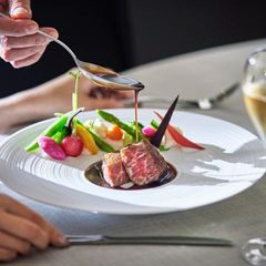【華やかな披露宴を彩る料理体験】オープンキッチンから届く出来立ての一皿を、シェフのライブ感と共に堪能。国産牛フィレやオマール海老など贅沢食材で、五感を刺激する美食のひとときを体験できます。