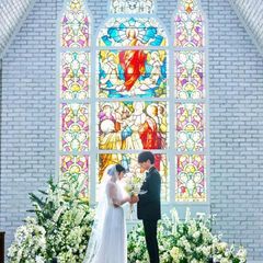 【感動的な挙式を演出】天井高8mのステンドグラス×バージンロード13mの独立型チャペル。ステンドグラスから差し込む自然光は新婦の美しさを際立たせます。ブライダルフェアで体験してみてください。