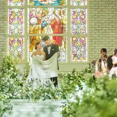 【感動的な挙式を演出】天井高8mのステンドグラス×バージンロード13mの独立型チャペル。ステンドグラスから差し込む自然光は新婦の美しさを際立たせます。ブライダルフェアで体験してみてください。