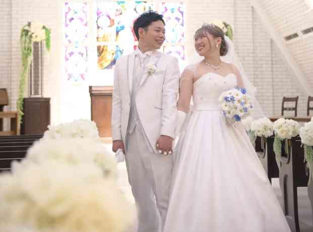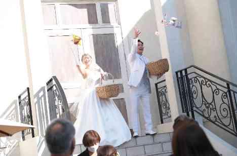 ステンドグラスが輝くチャペルで行われた感動的な教会式の後には、晴天の中、ガーデンセレモニーを行いました。フラワーシャワーの後は、ゲスト全員参加のお菓子まきを行いました。当たりのお菓子をgetした方には披露宴で乾杯のご発声をお願いしました。お二人がカンペを作ってくださいってましたが、当たりを受け取ったお兄様は、カンペに頼らずご自身なりのお言葉でお祝いを伝えてくださいました。