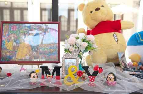 テーブルコーディネートや、席札、ケーキなど、全てがディズニーで統一されたお二人のご結婚式は、ご親族様とご友人様数名の少人数で行われました。席は、一つの長いテーブルにお二人もゲストの皆様と一緒に座り、皆でお話し出来るアットホームな空間になりました。歓談や再入場後のフォトラウンドでも、ゆっくりお話ししながら沢山お写真を撮られていて、お二人もゲストの皆様もとても楽しまれていました。
