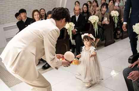 お二人の誓いの言葉は、招待状でゲストの皆様から募集し、お二人が選んで発表する斬新な演出でした。そして、結婚証明書はおふたりの入籍日の2月5日から「にこちゃん」のゴロ合わせで、ゲストの皆様にまるいシールににこちゃんを書いて貼っていただきました。リングガールはお二人の姪っ子ちゃん二人が務めてくれ、とても可愛らしく、会場が和やかな雰囲気になりました。お二人らしさが溢れるとても楽しい人前式になりました♪