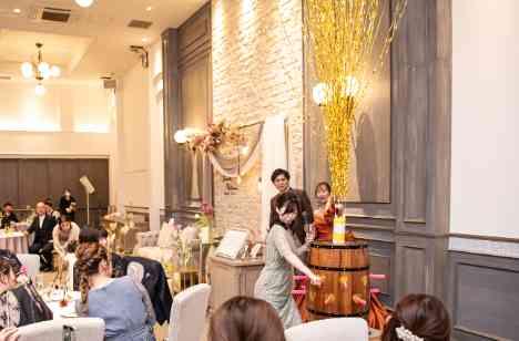 とにかくワイワイ楽しく!と希望されていたお二人。ご友人様が多く列席されていたので、インタビュー形式でご友人様からお二人とのエピソードを伺いました。再入場では、新婦様はどこから入場するでしょう?をゲストの方にも参加して頂きました!ドキドキの黒ひげ危機一髪では、テーブルの代表者が剣を刺していき、当たった方にはポッキーの日にちなんで、ポッキー・プリッツをプレゼント♪終始とても盛り上がるパーティーでした。