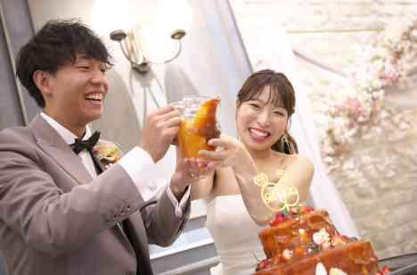 ケーキ入刀では、カラードリップセレモニーを行いました。ケーキにキャラメルソースがとろ~りと流れる、可愛らしい演出。そして、ファーストバイトの前に、夫婦の大先輩である親御様にお手本バイトをお願いしました。恥ずかしそうに、でも嬉しそうな様子でしっかりとお手本を務めてくださいました。そしてファーストバイトの後にはお二人のお子様へエンジェルバイトもして頂き、とても微笑ましいご家族愛溢れるシーンでした。